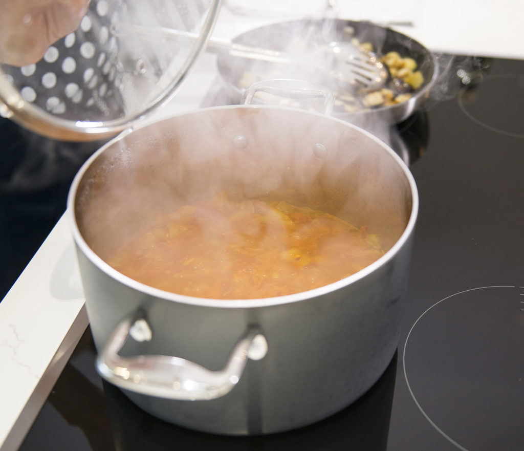 - In a deep wide bottomed pan, heat some olive oil then add the diced onion and cook until soft but not brown.