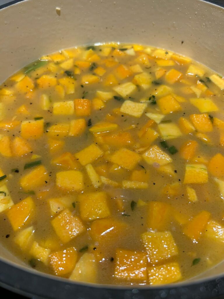 • Add in the squash, wine and chicken broth and season with salt and pepper.