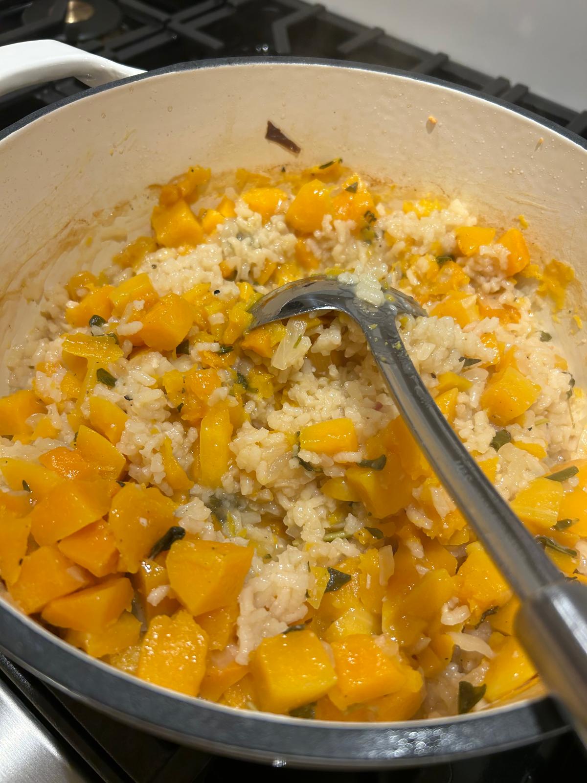 An easy, oven-baked risotto loaded with butternut squash, herbs, and crispy pancetta.