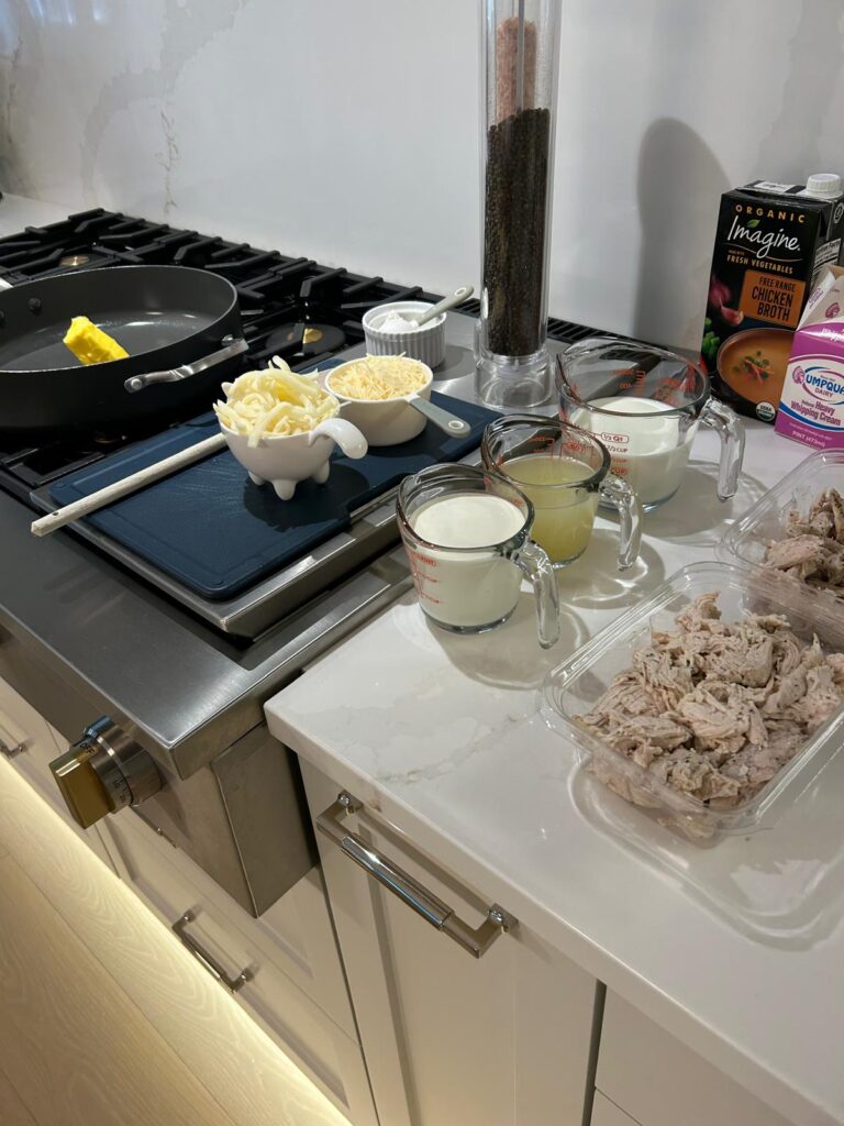 - Add in the milk and broth whilst stirring and bring to a simmer.