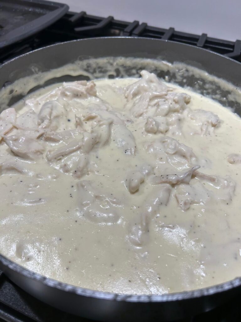 - Cook stirring regularly for around ten minutes until the sauce has thickened. Add in the cooked chicken and allow to heat through.