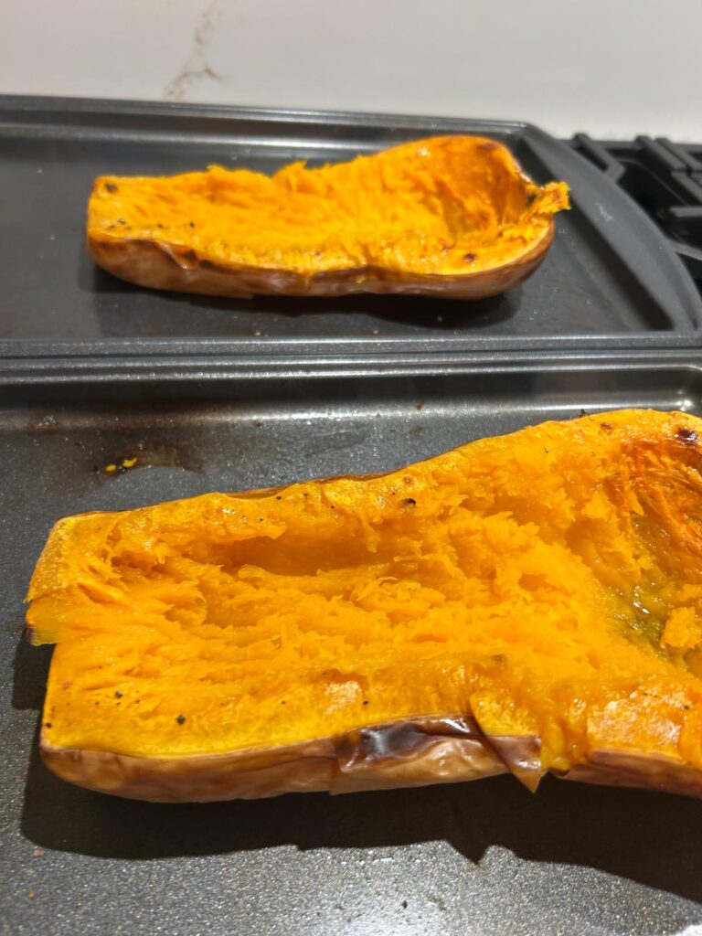 - Preheat the oven to 400ºF / 200ºC degrees and lay the halved squash skin side down onto two baking sheets.