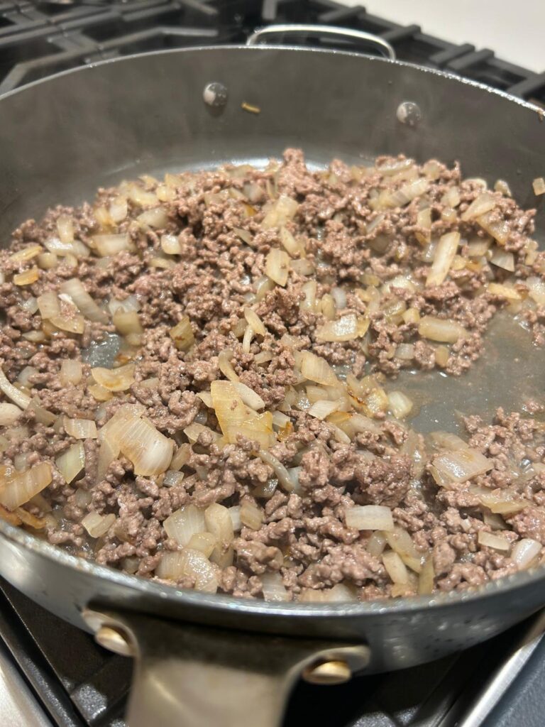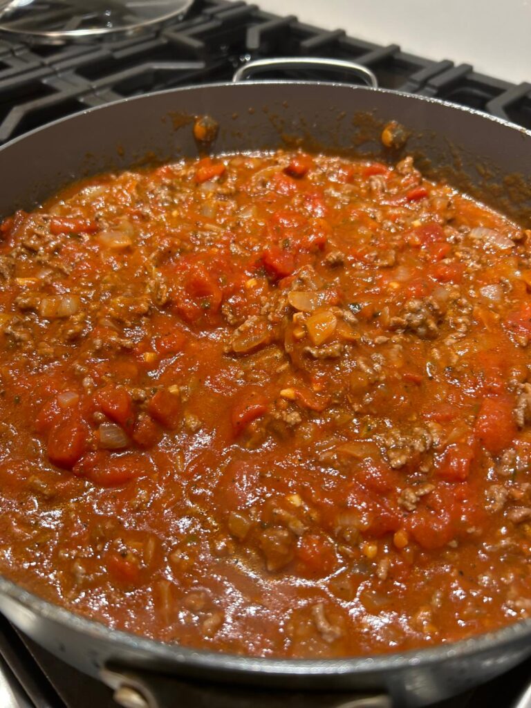 - Add half of the cooked ziti to the baking dish and top with half of the meat mixture.