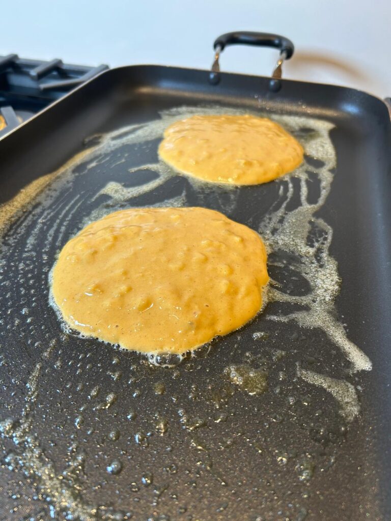 - Heat a little oil in a skillet over medium heat. Using a measuring cup, scoop up the batter and pour it into the hot skillet.