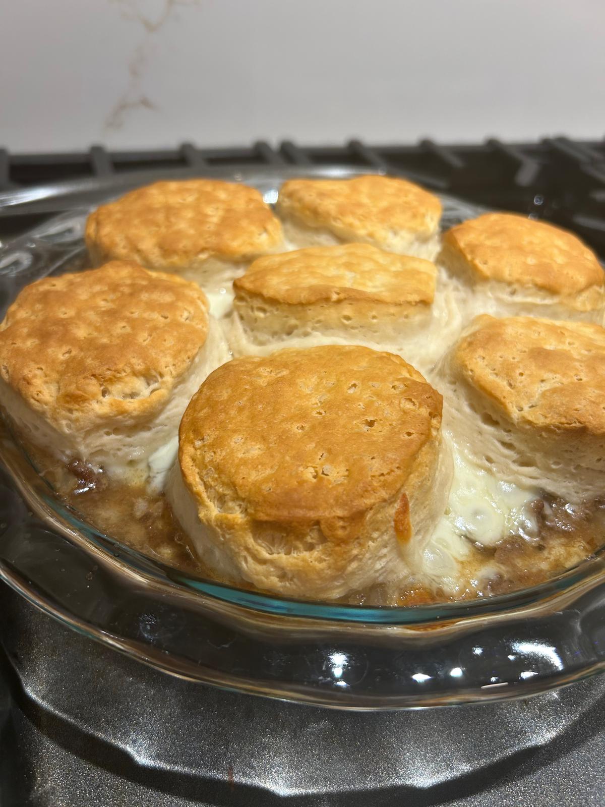 - Top with the biscuits and bake to around 20 minutes until the biscuits are risen and golden and the meat mixture is bubbling.