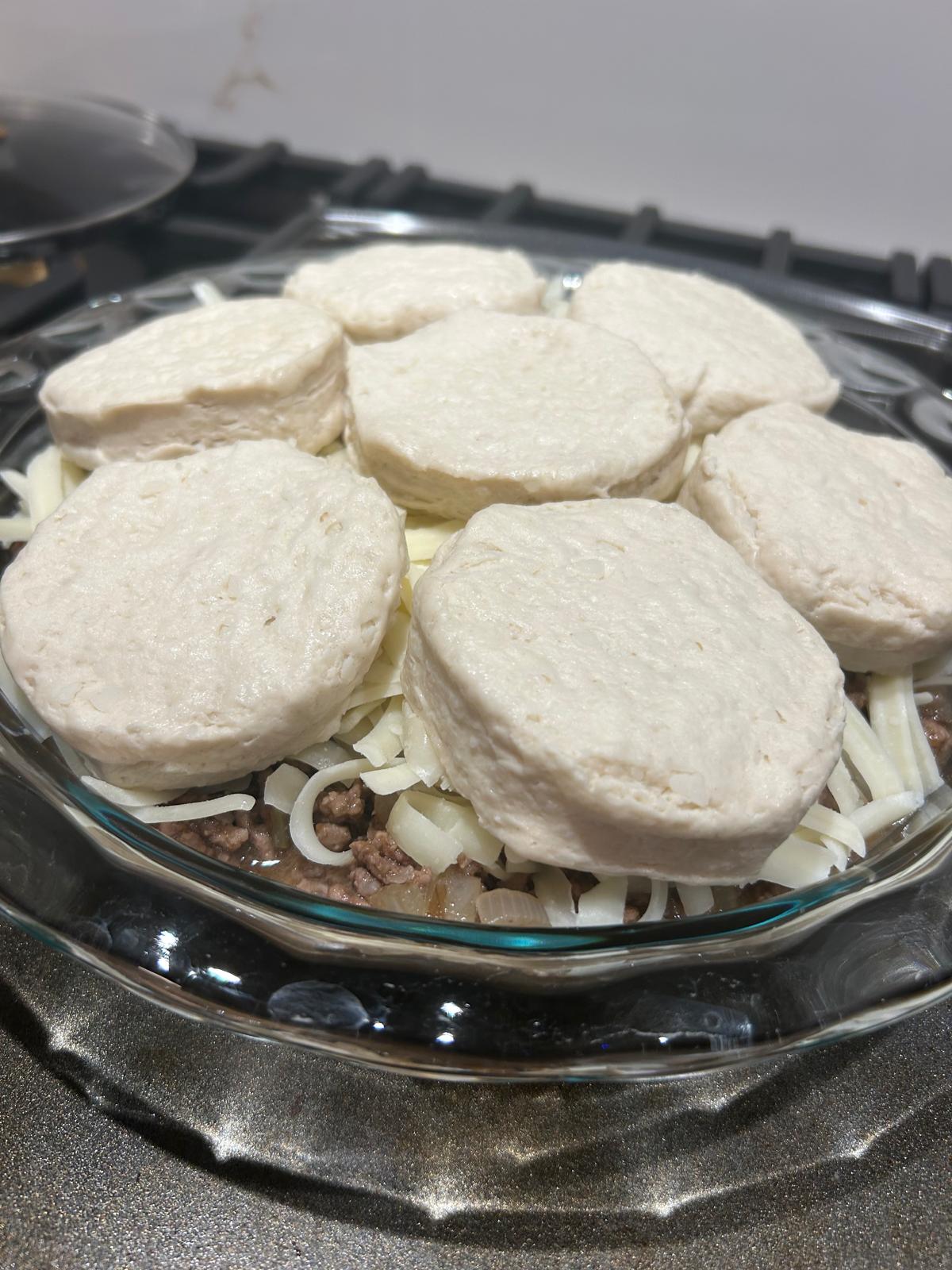 - Top with the biscuits and bake to around 20 minutes until the biscuits are risen and golden and the meat mixture is bubbling.