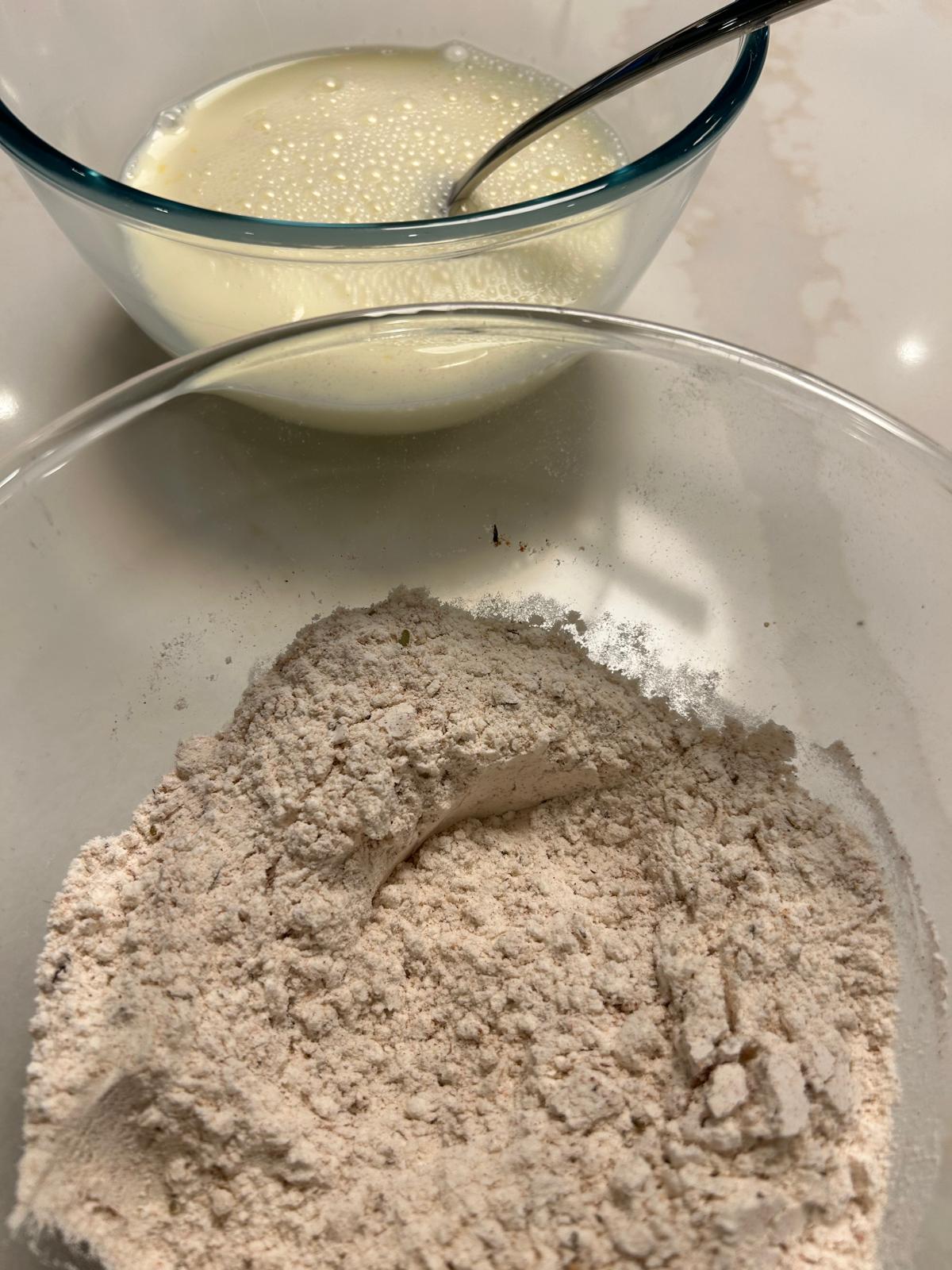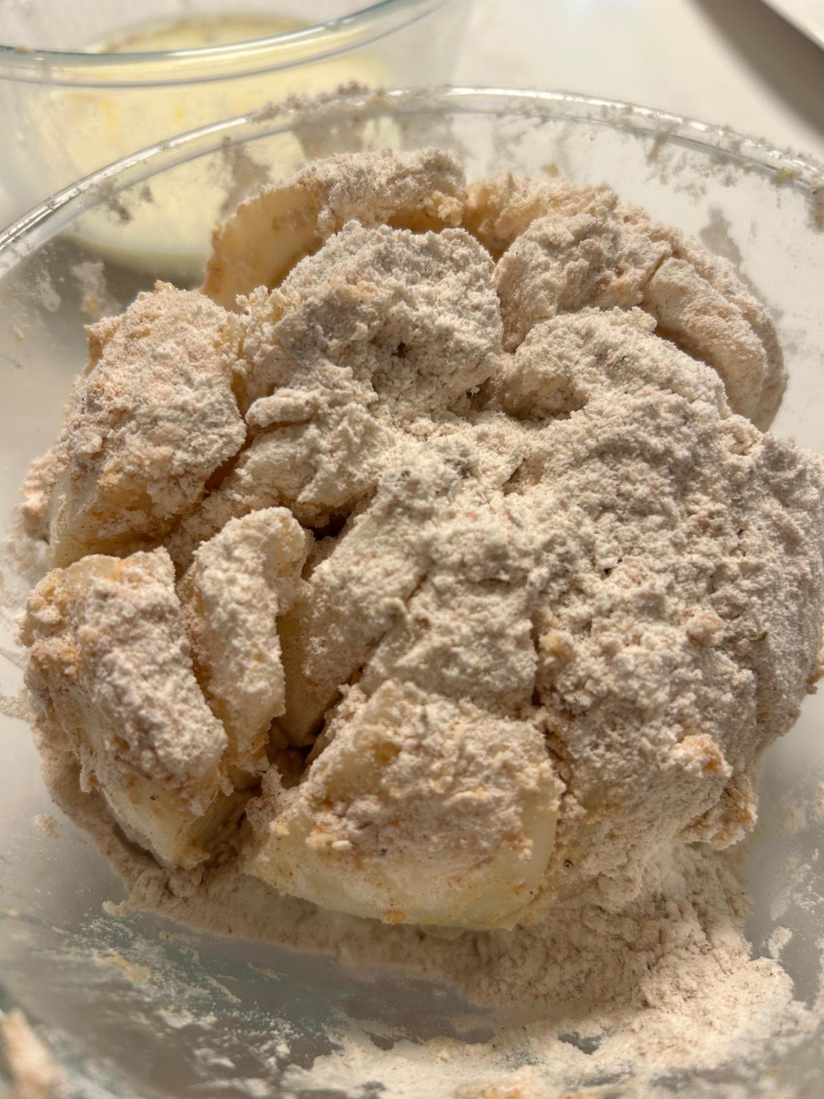 - Make the coating by mixing the egg and milk in one bowl then placing all the dry coating ingredients int another bowl and stir to ensure they are combined.