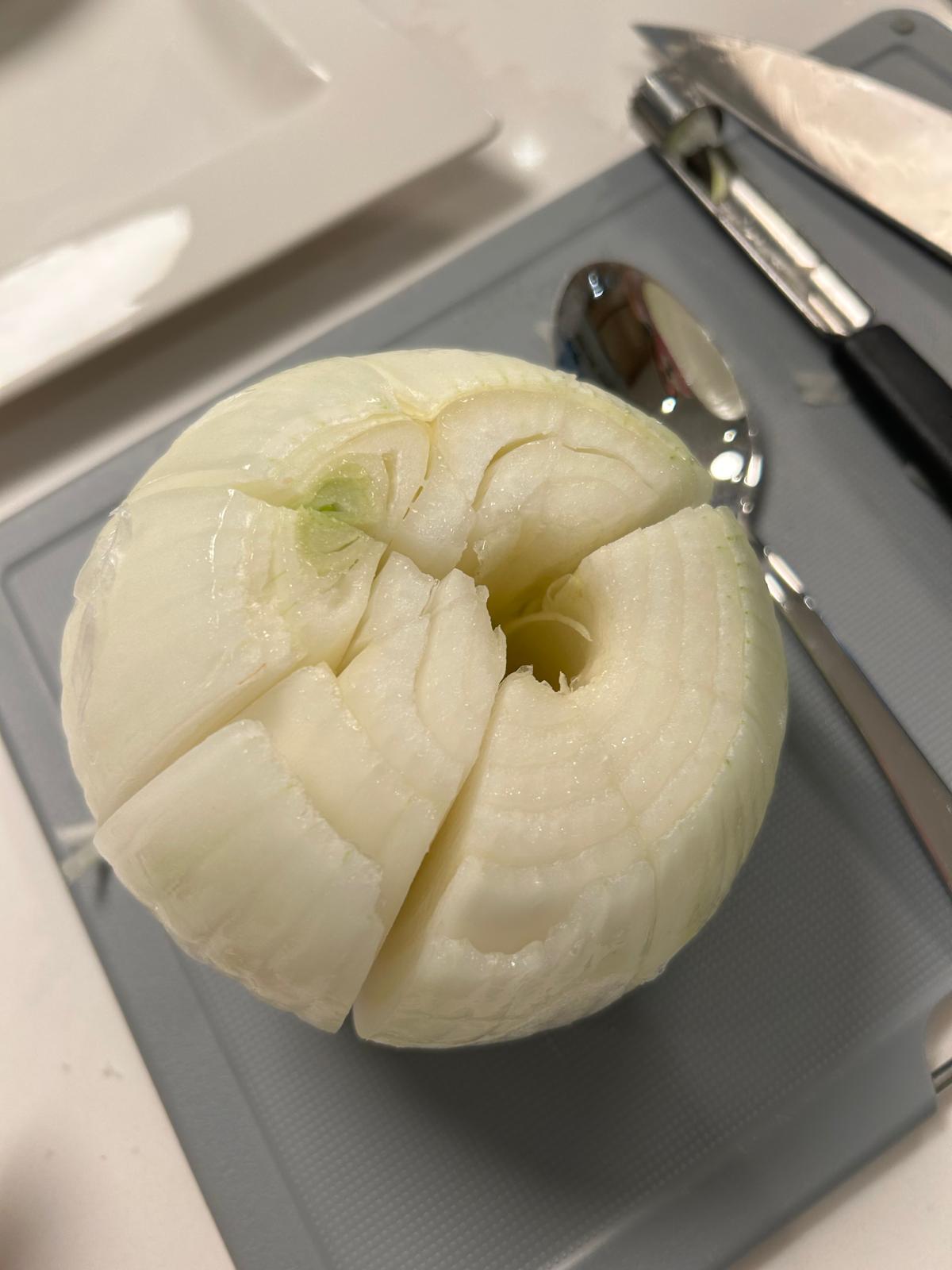 - Prepare the onion by remove the outer skin then remove a one inch center core using an apple corer but do not core completely the way through. You need to leave the root at one end in tact to hold the onion together.