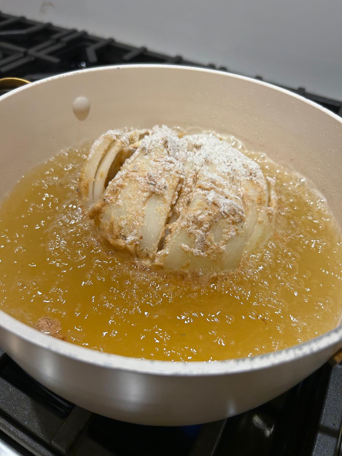 - Using a deep sided pan, heat 3 inches of oil in the base of the pan to 350ºF / 180ºC degrees, place the onion into the hot oil with the root at the base then after 3-4 minutes, turn to cook the other side.