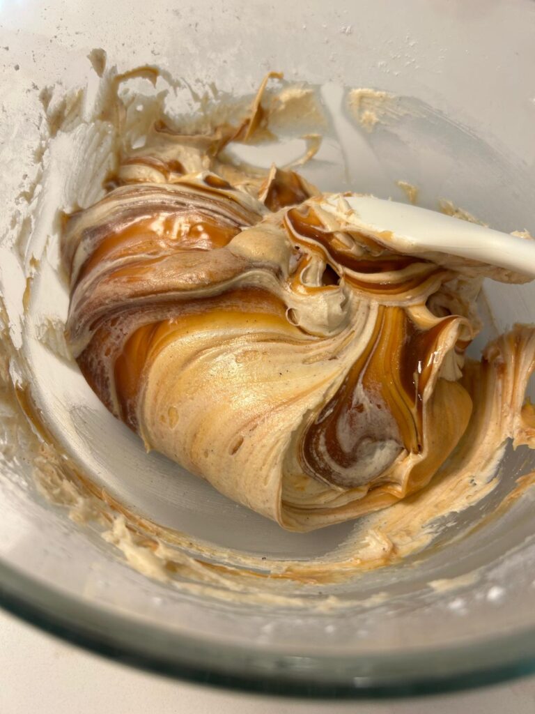 - Swirl in the dulce de leche with a spatula but do not mix in completely to leave visible swirls.