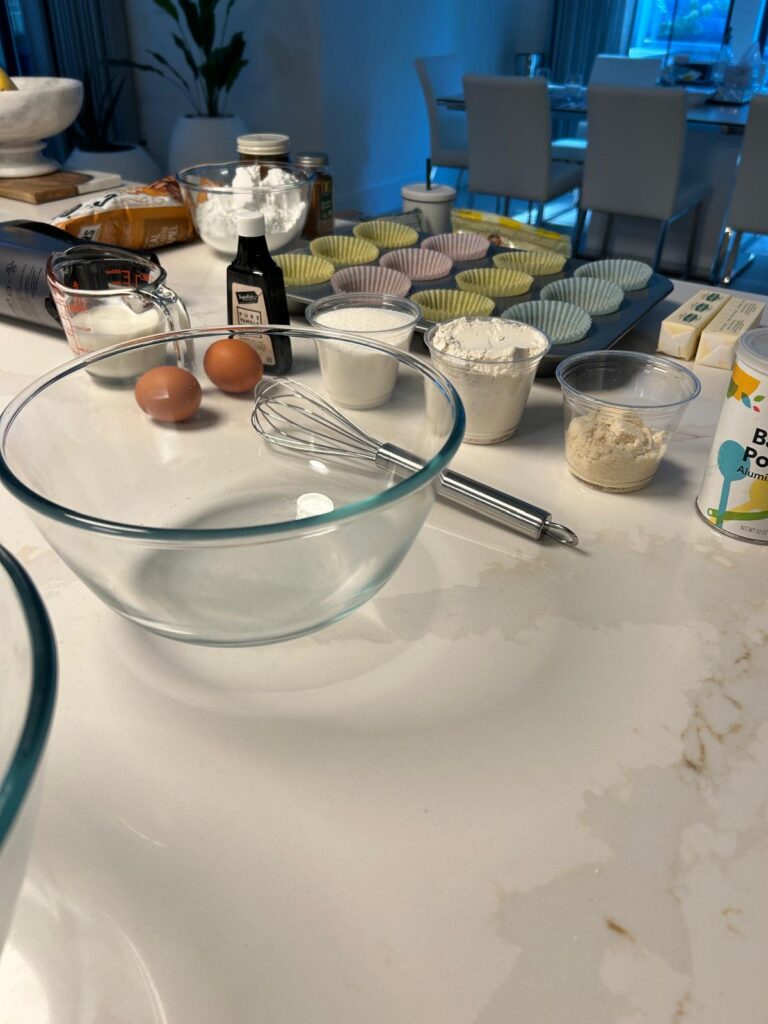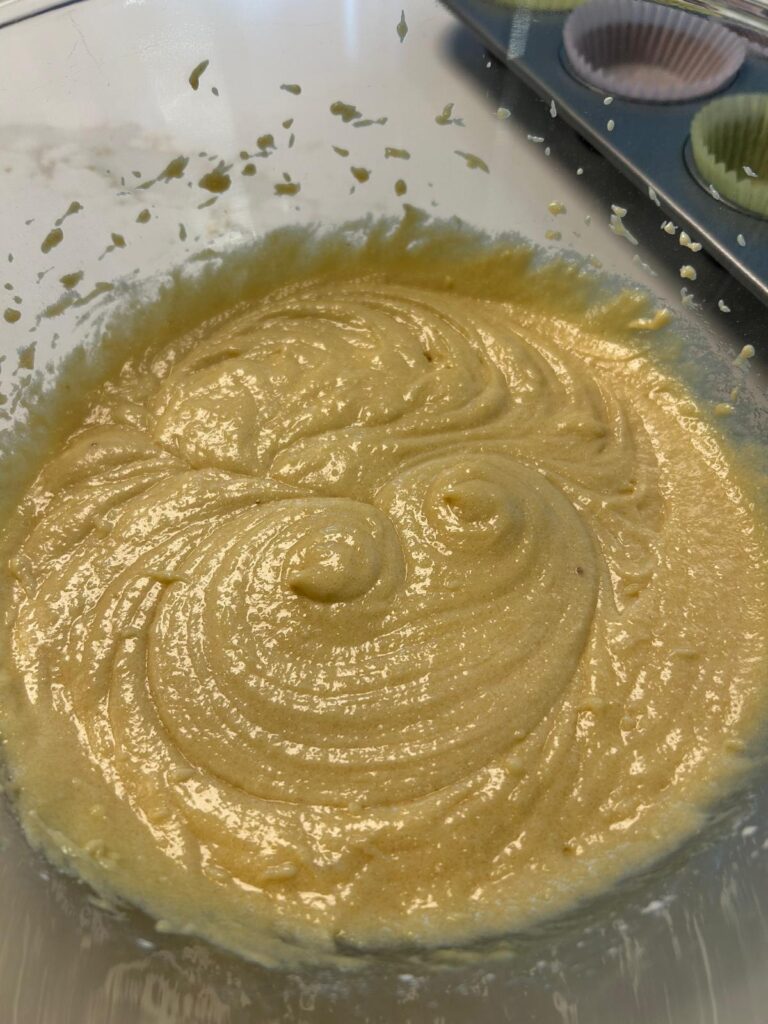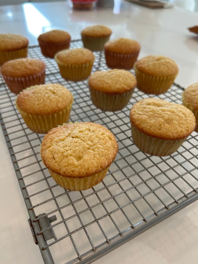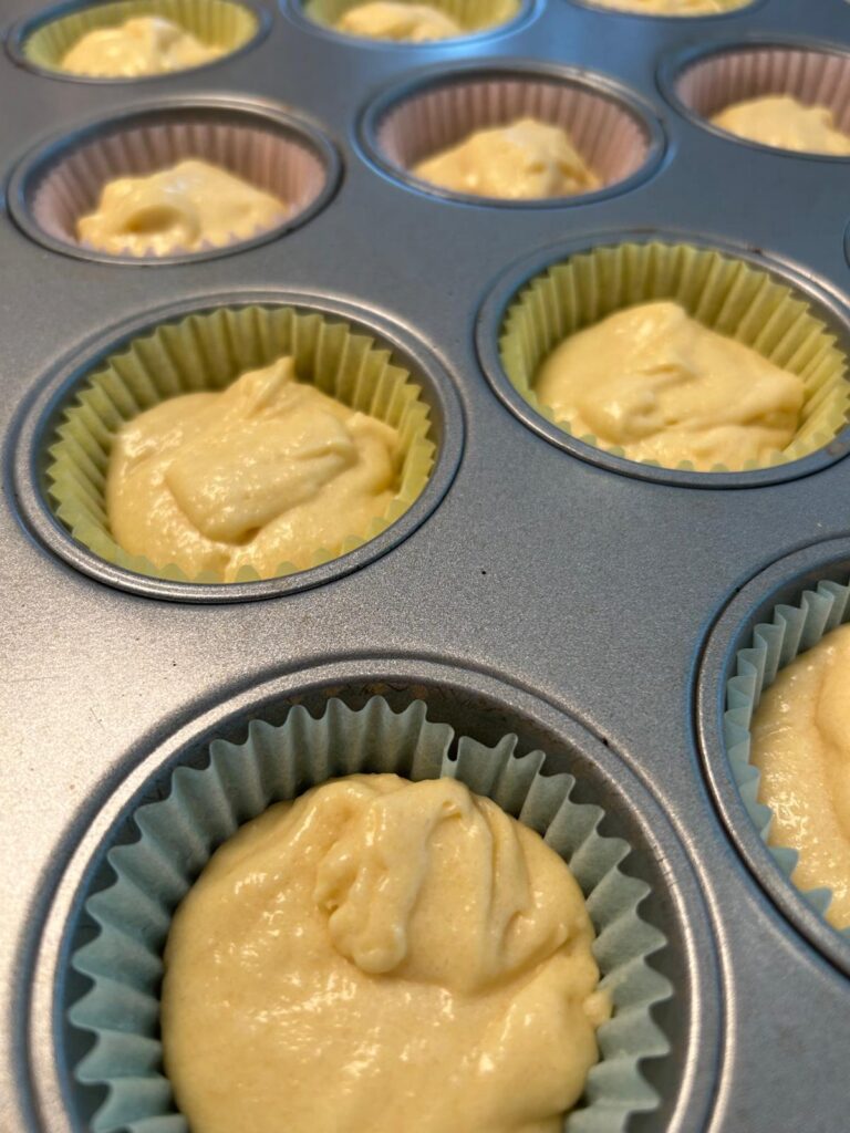 - Fill each muffin case ¾ full then bake in the oven for around 18–22 minutes until a toothpick inserted into the center comes out clean or until the top springs back when pressed gently.