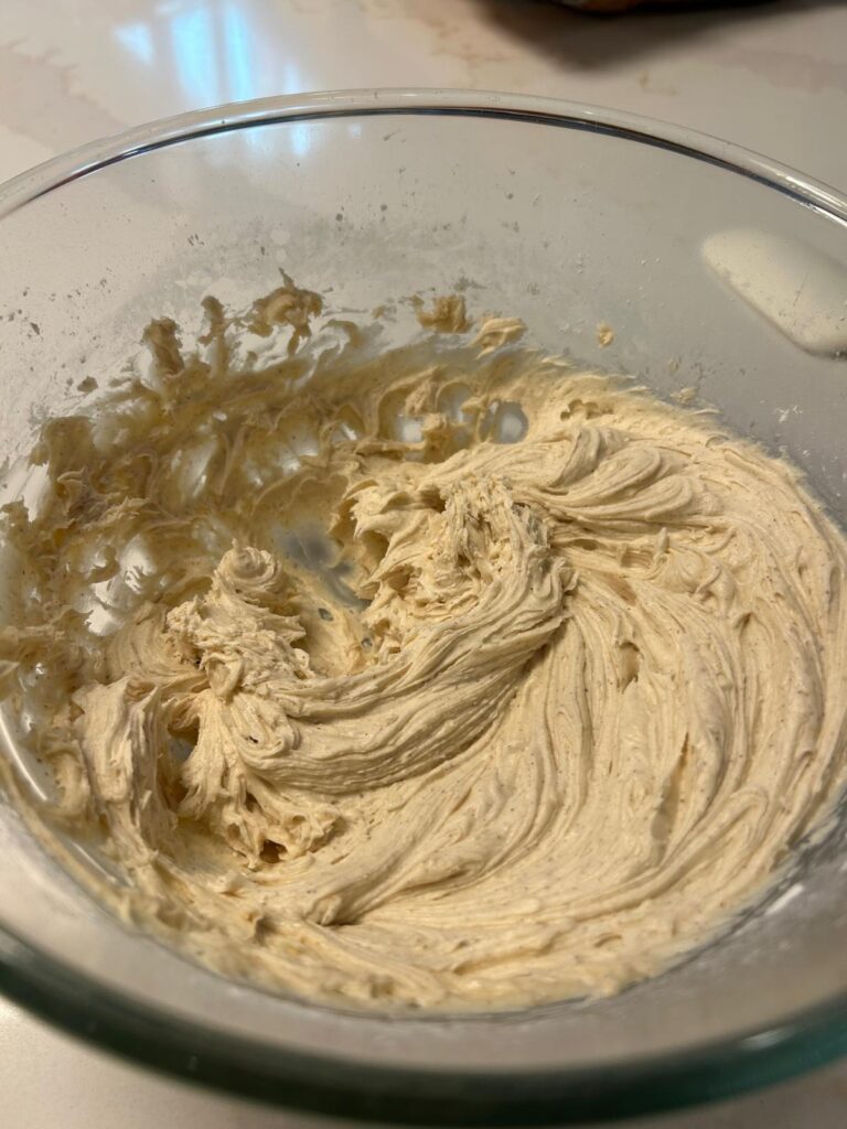 - To make the frosting, mix together the butter, powdered sugar and pumpkin pie spice. Add in the vanilla extract and beat until fluffy.