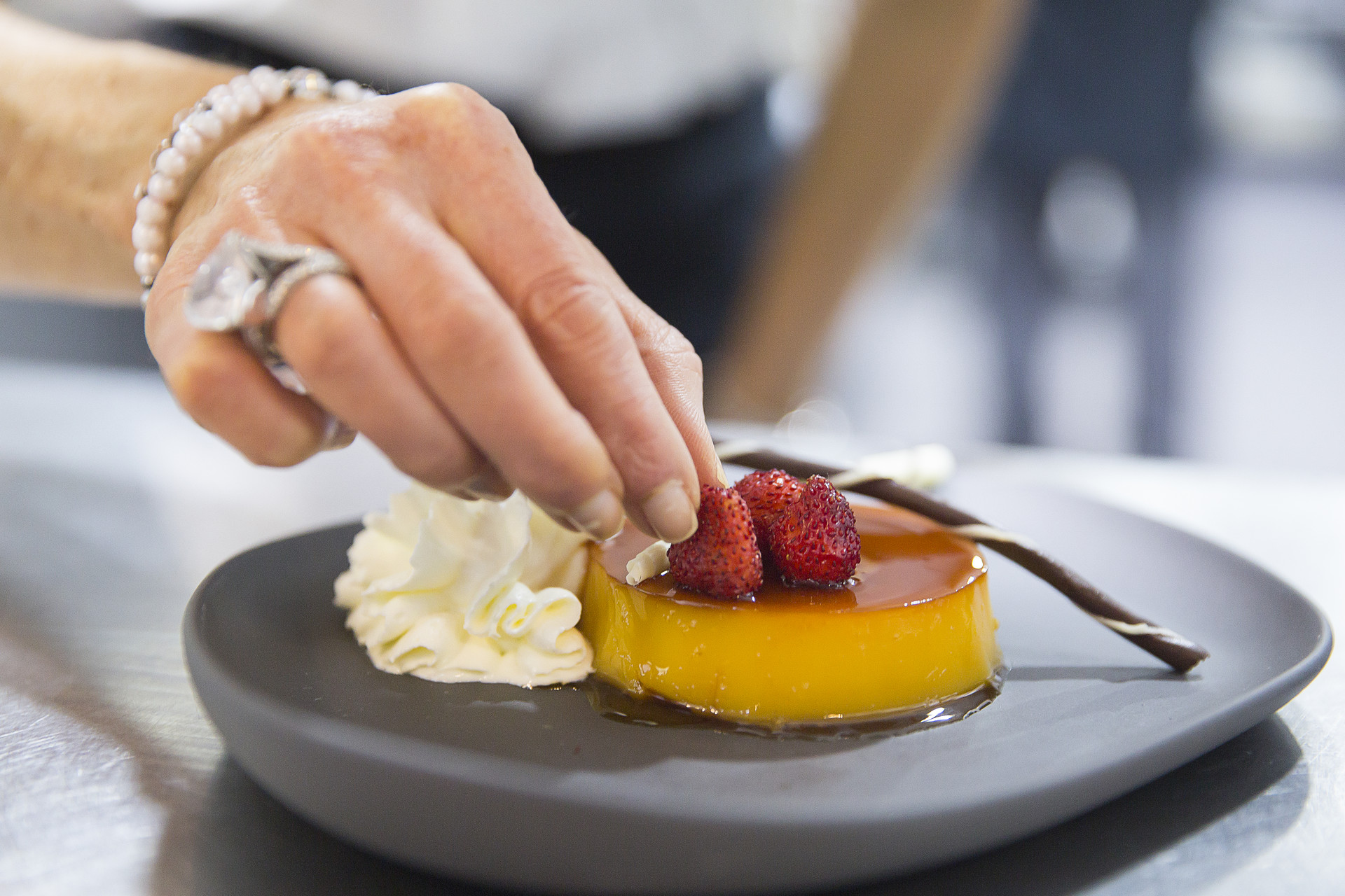 - In small flan molds, pour a layer of caramel (this can be bought or homemade) then top with the foamy mixture.Place the molds into a steam oven at 98°C for approximately 20 minutes until set.