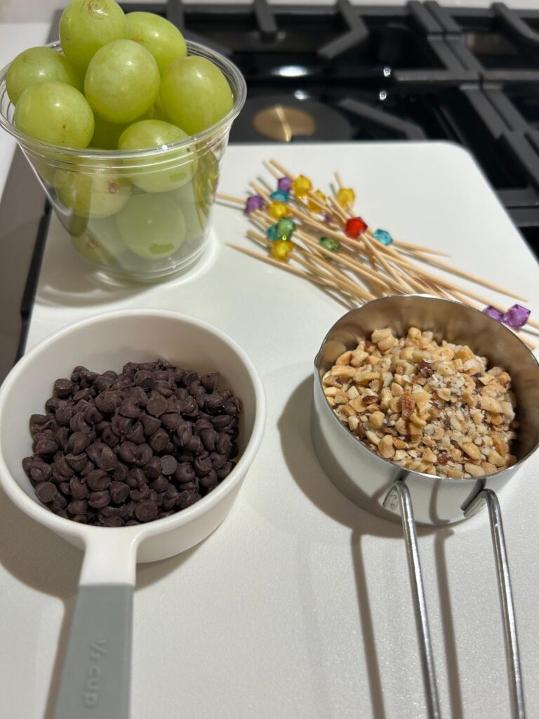 • Place the toppings on separate plates. Stick a mini skewer into each grape, then dip three quarters of the way up the sides of the grape into the caramel sauce.
