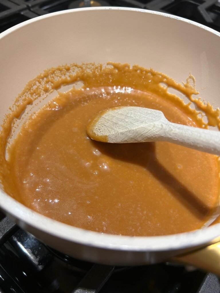 • Heat the caramels and cream in a saucepan. Once totally melted, continue to cook for a further five minutes, then turn off the heat.