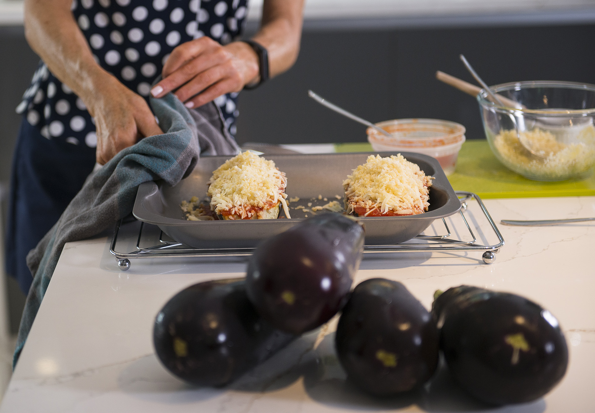 - Remove from the oven. Cover each of the aubergine halves with the tomato sauce, sprinkle the mozzarella cheese over each half.