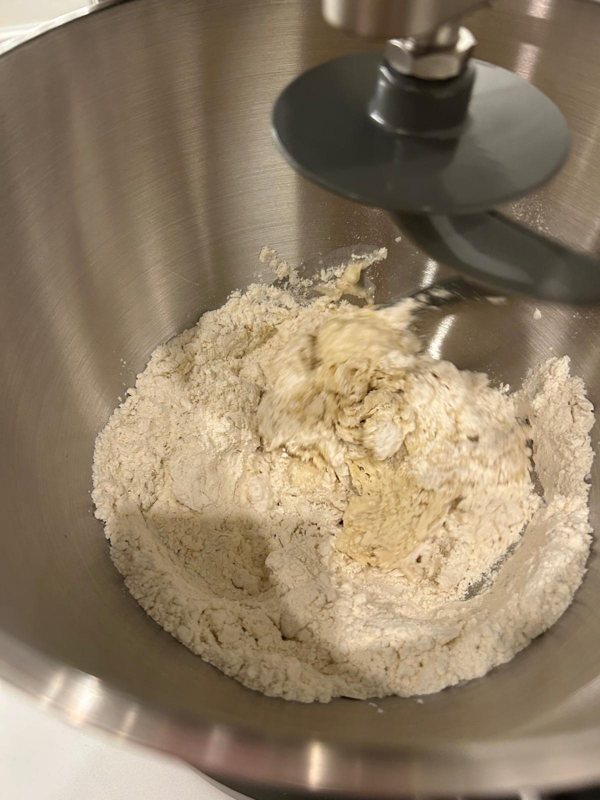 • Mix together the flour, half a cup of water, quarter of a cup of oil and one teaspoon of salt in a stand mixer with the dough hook fitted. Beat until you have a soft and sticky dough which should take around five minutes.