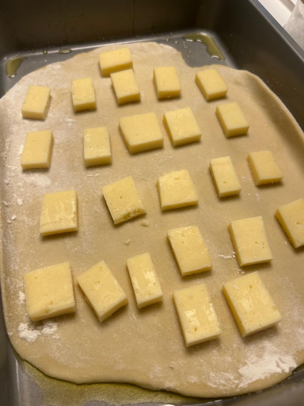 • Drop the torn cheese on top of the dough in an even layer then top with the second dough.