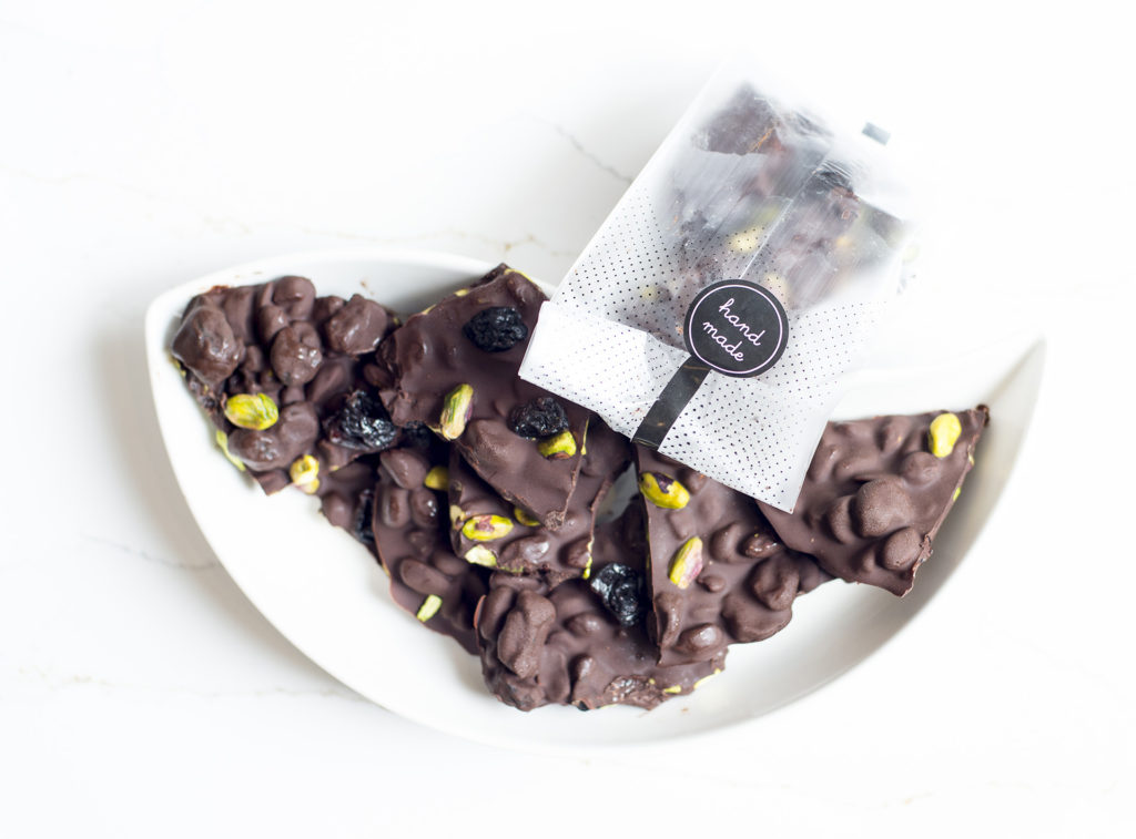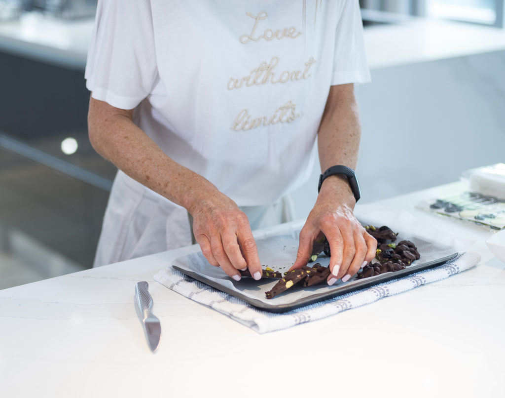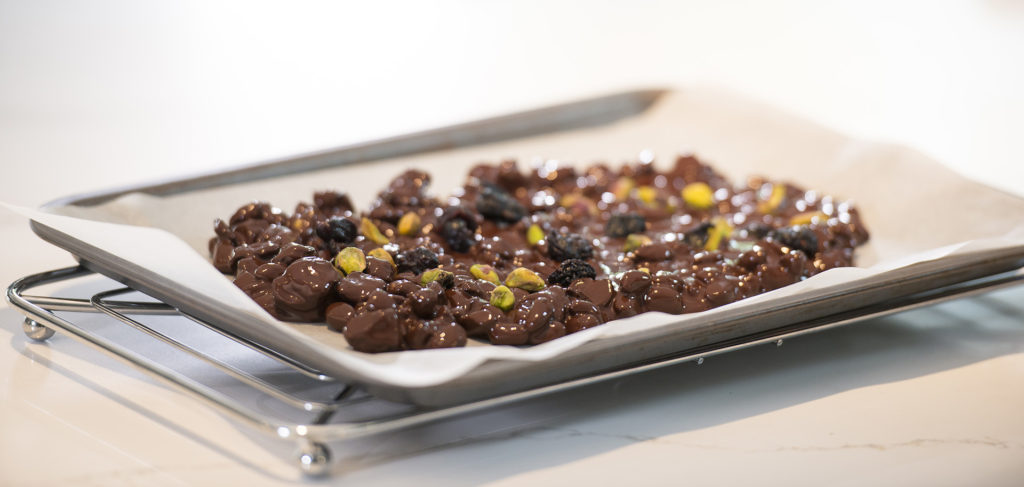 • Sprinkle over the extra chopped pistachios and cherries before placing in the freezer for one hour to set.
