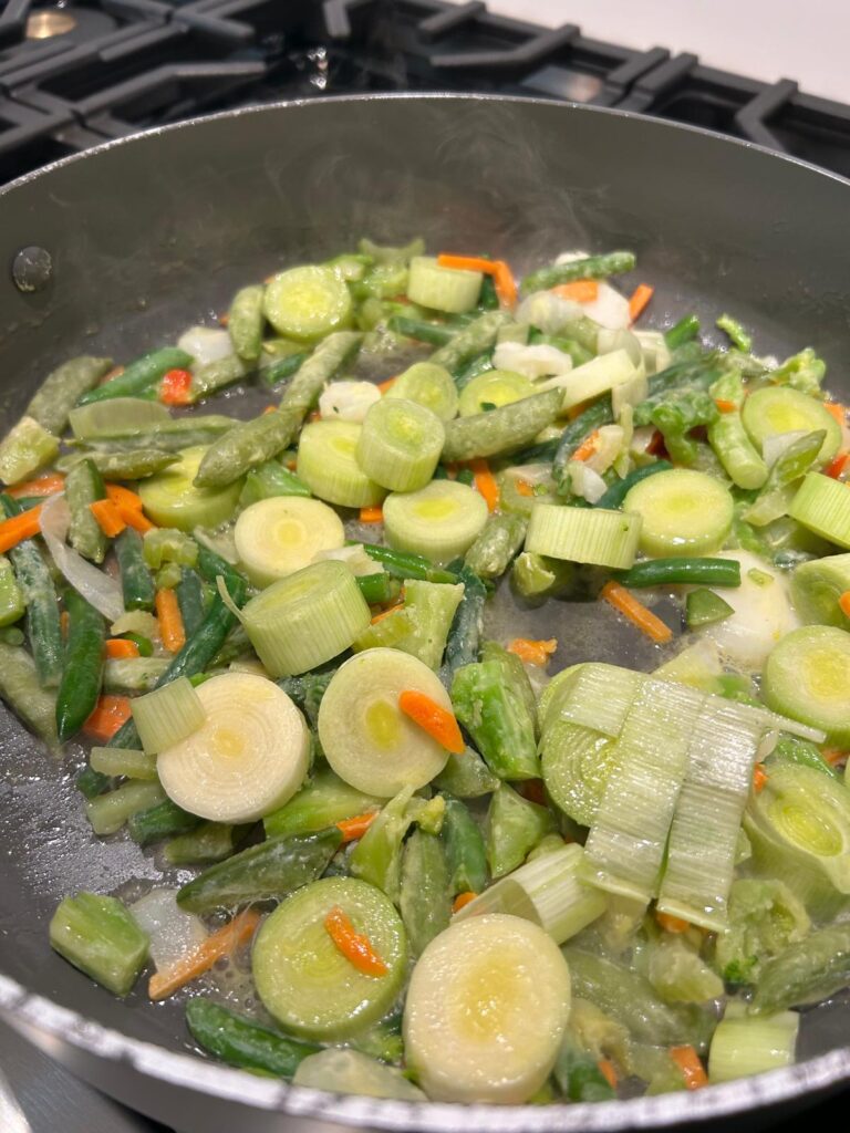 - In a large pan, melt the butter over a medium heat and add in the frozen vegetable mix together with the leek. Cook, stirring regularly, for around 6 minutes until the vegetables are browned and any liquid has evaporated.