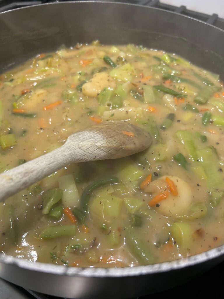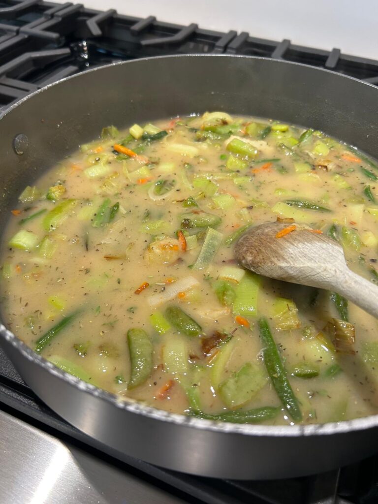 - Sprinkle with the flour and stir, continuing to cook for around one minute before adding in the broth, poultry seasoning, thyme, salt, and pepper.