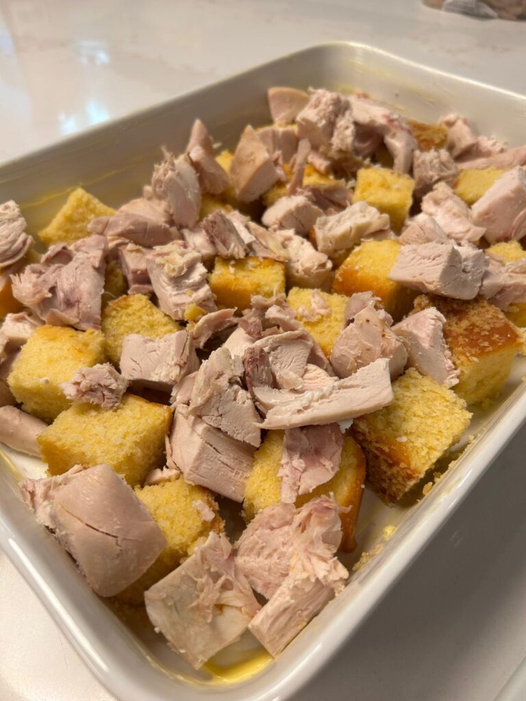 - Combine the chicken and cornbread in a large bowl and set aside.
