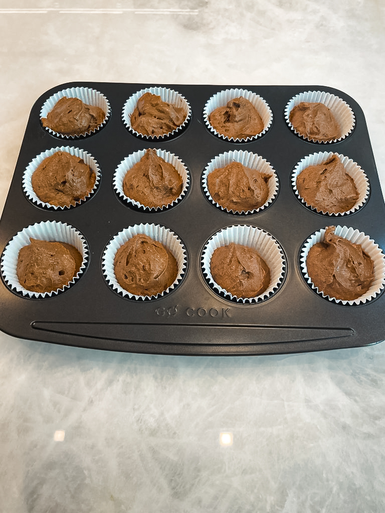 - Using an ice cream scoop, scoop equal amounts into each paper case.