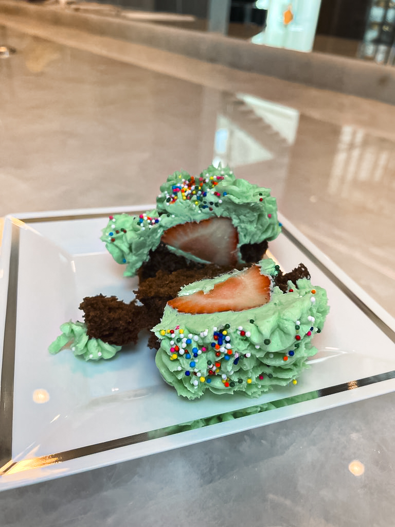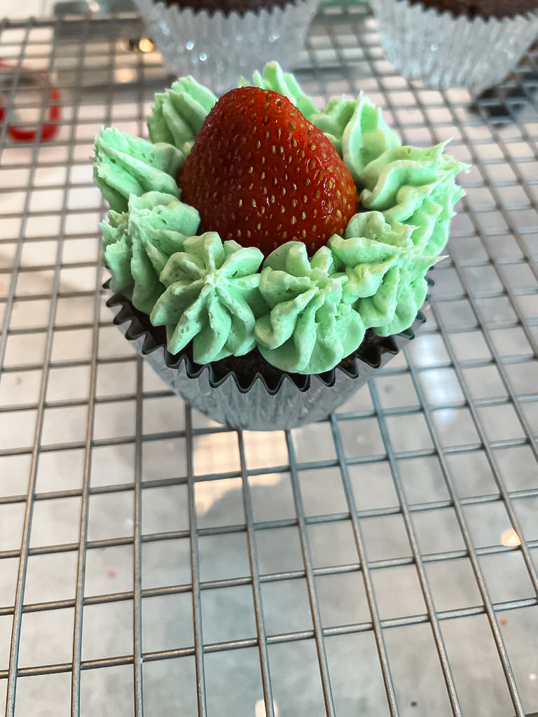 - If adding a surprise strawberry into your cupcake, i just remove a little of the top of the cake to create a perfectly flat surface. I pipe a little buttercream as a base on which the strawberry can sit. Place the strawberry with the flat cut side down then pipe around the base then upwards to create a tree shape that totally covers the strawberry.