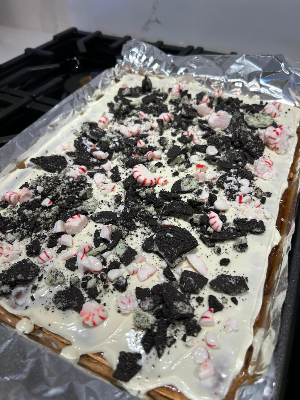- Spread the melted chocolate into an even layer. Top with the broken sandwich cookies and crushed peppermint candies.