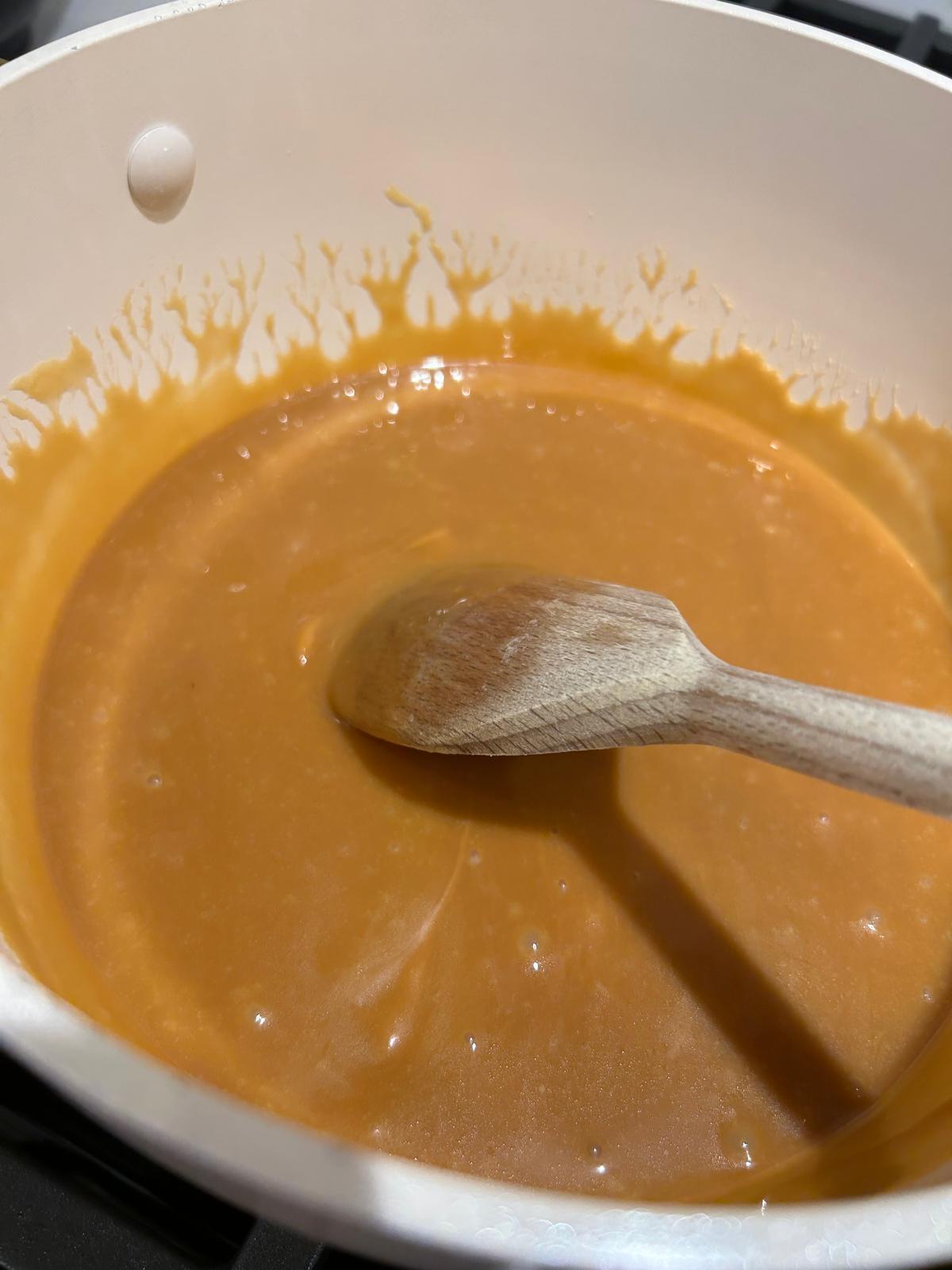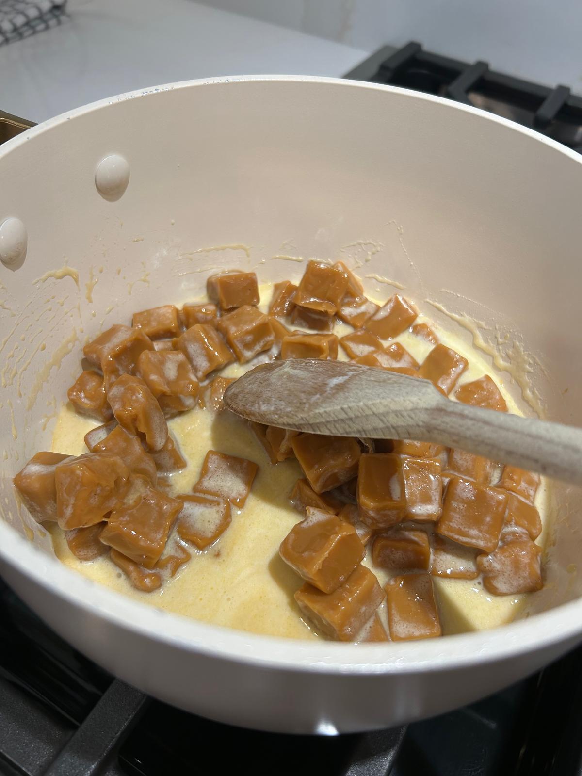 • Add in the caramels and continue cooking until fully melted into a smooth, glossy mixture.