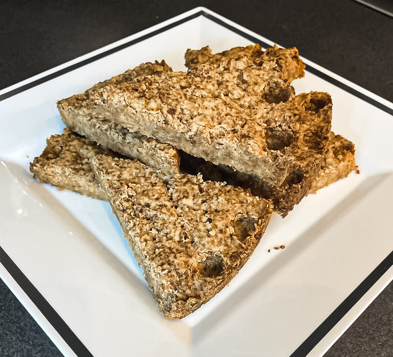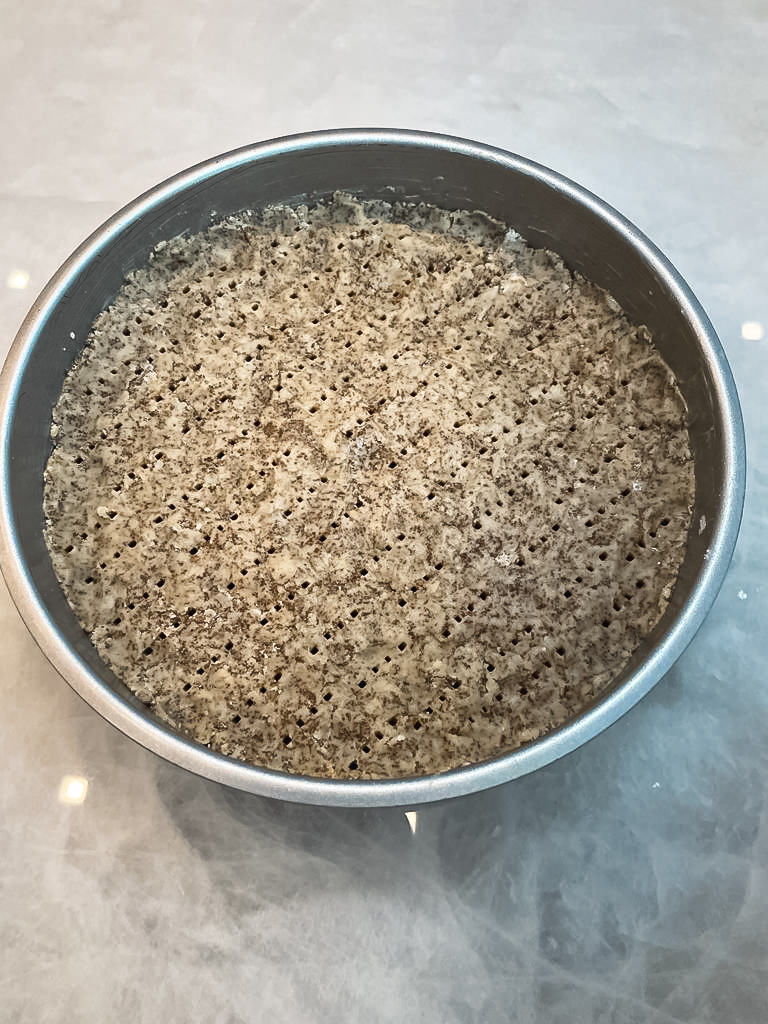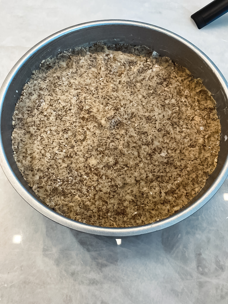 - Press the mixture into the cake tin until flat. I like to use the back of a flat measuring cup to do this.