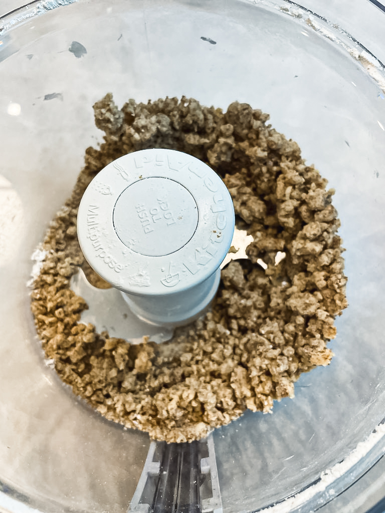 - Add in the butter and pulse again until the mixture resembles wet sand.
