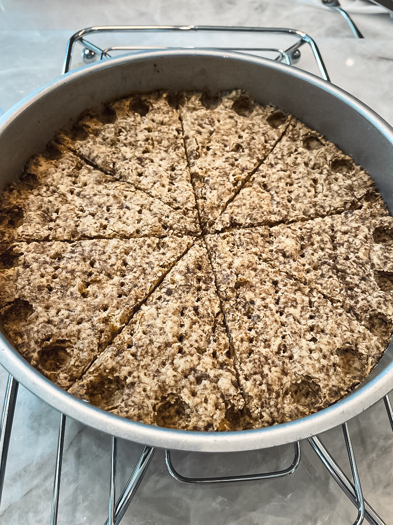 - Once removed from the oven, I like to go over my fork marks by gently pricking the shortbread again. Whilst still warm, use the end of a wooden spoon to make an indent all around the edge of the shortbread.Again whilst still warm, using a long knife, score where the shortbread will be cut into slices.