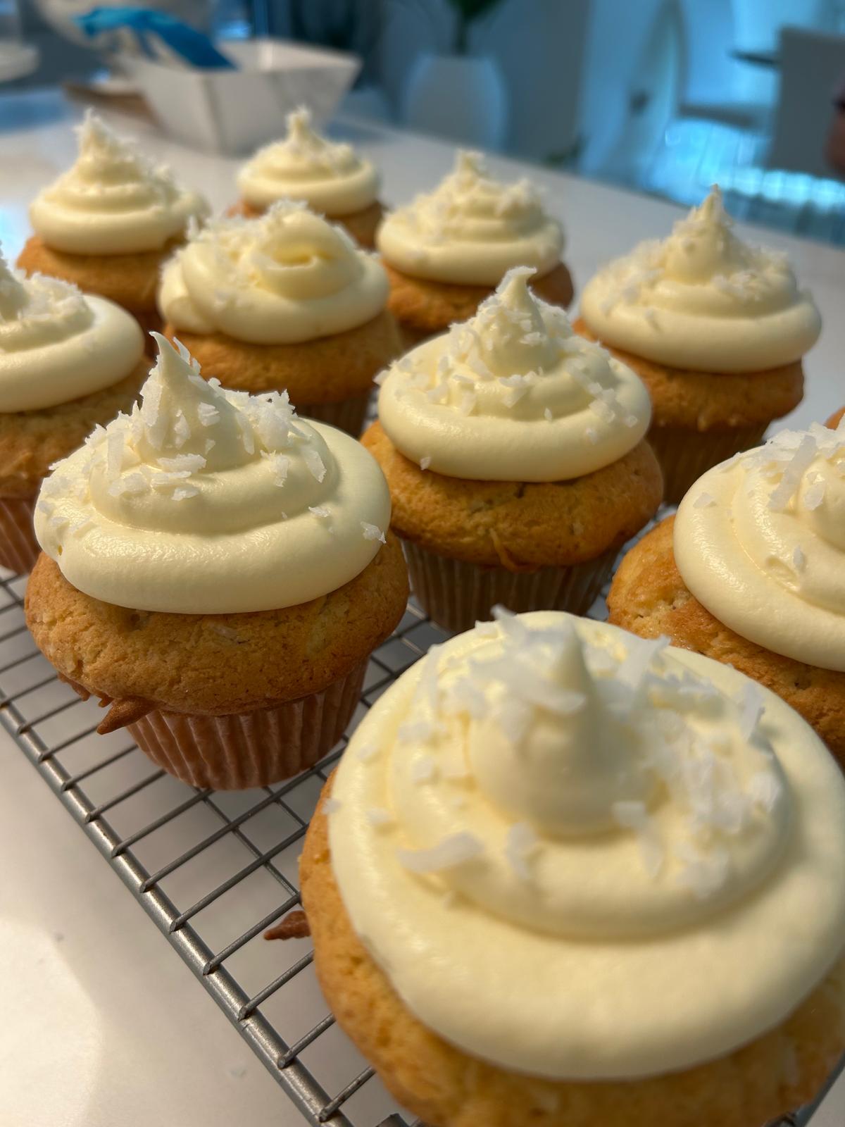 - Pipe onto the cooled cupcakes and top with the toasted shredded coconut.