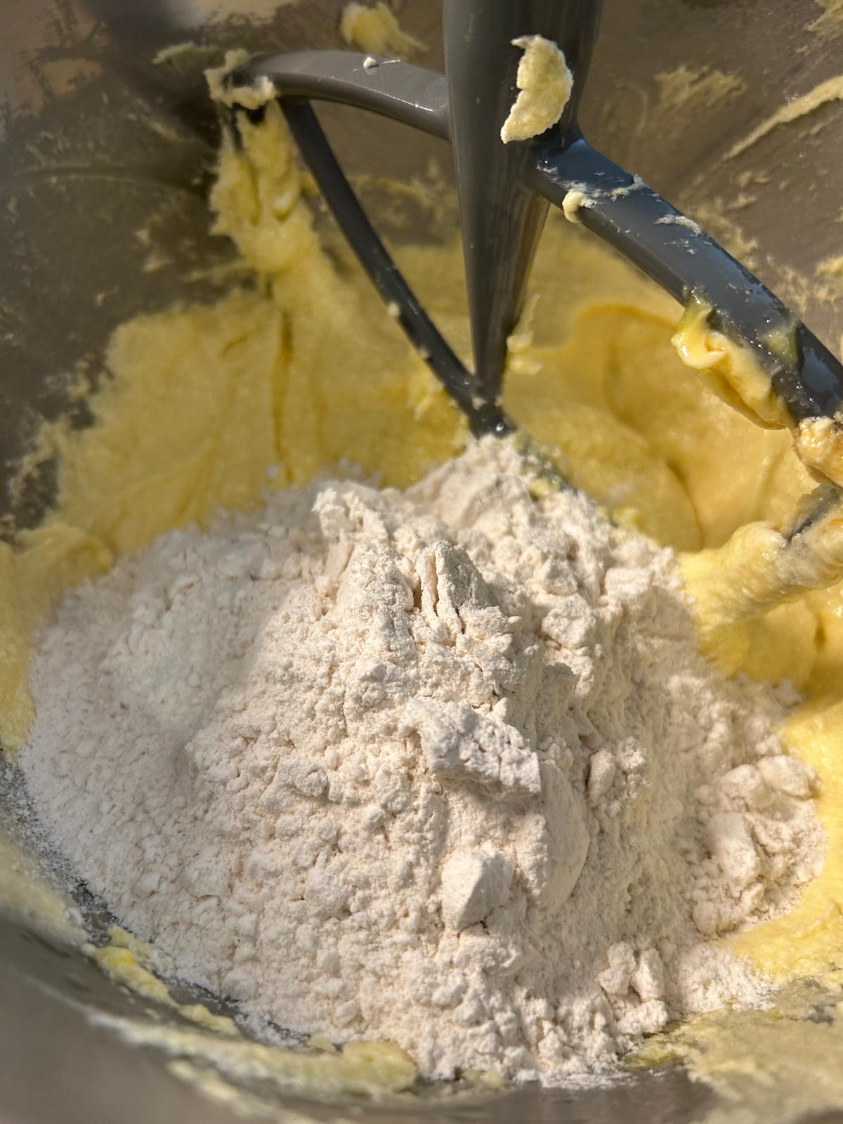 - Mix together the dry ingredients of flour, baking powder, baking soda and salt and begin to add this to the creamed butter and sugar one large spoonful at a time alternating with the milk mixture.