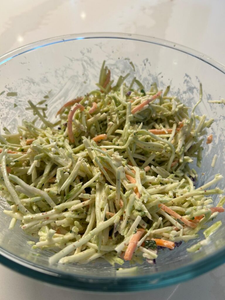 - Add in the slaw mixture and toss to coat then cover and set aside in the fridge.