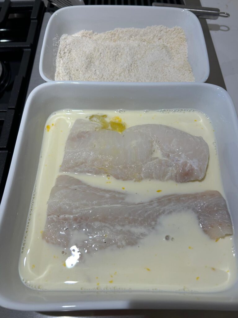 - Whisk the egg and milk together in a large dish and add in the cod fillets and allow to soak