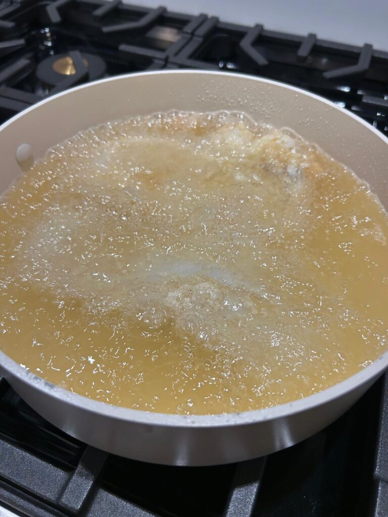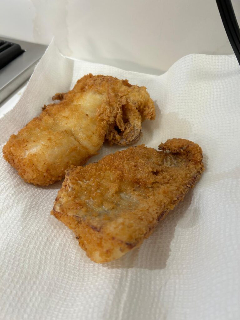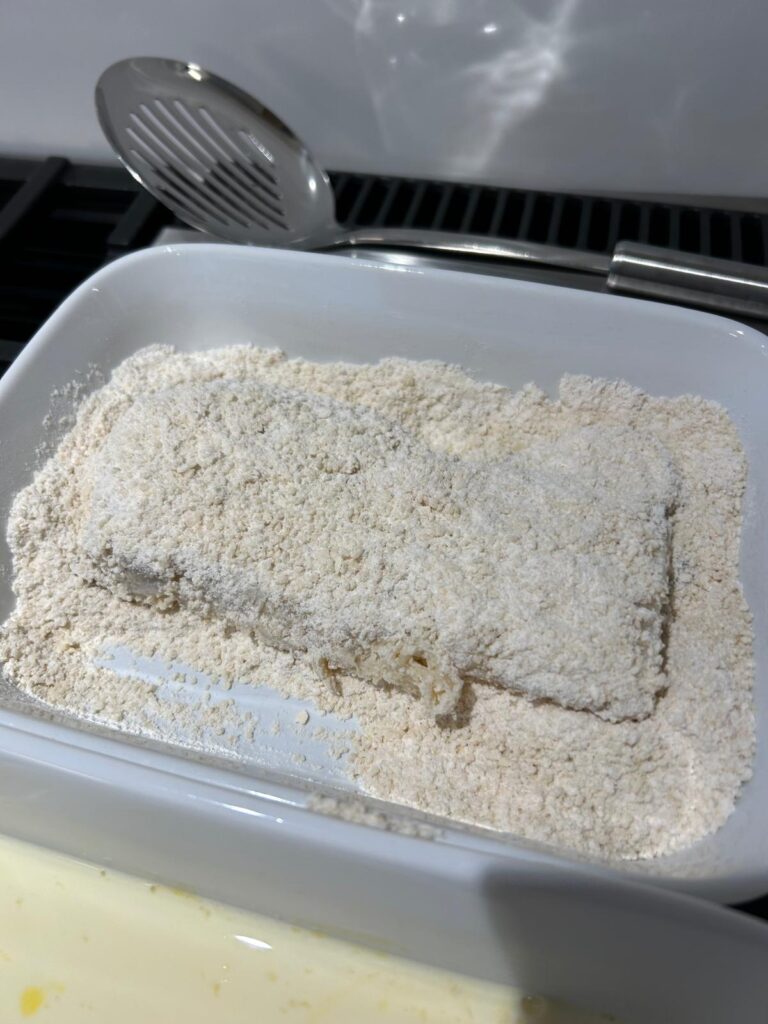 - Take the fillets of fish out of the egg and milk mixture and drop into the flour and breadcrumb mixture. Cover on all sides then drop into the hot oil.