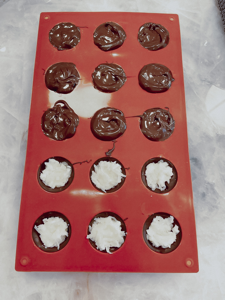- Once set, drop a teaspoon of the coconut mixture into each mould and press down to provide a flat surfaceDrop another teaspoon of the melted chocolate on top of the coconut mixture and brush to cover the whole surface