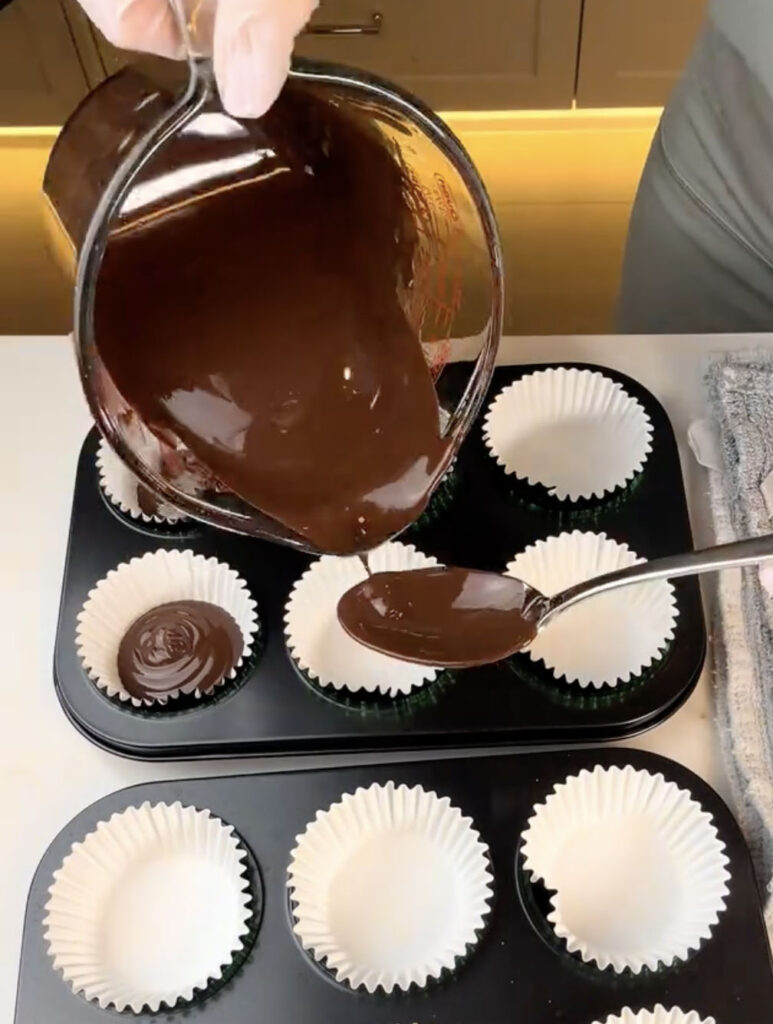 • Melt the chocolate and pour evenly between each cupcake liner.