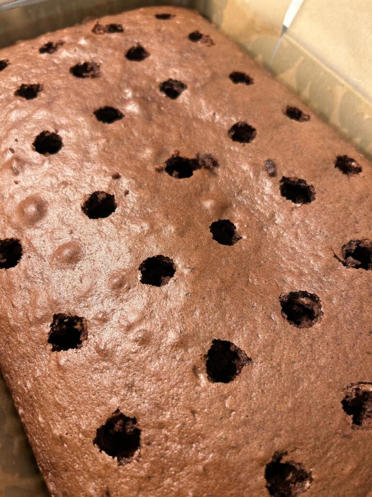 • Using the handle end of a wooden spoon, poke large holes all over the cake.