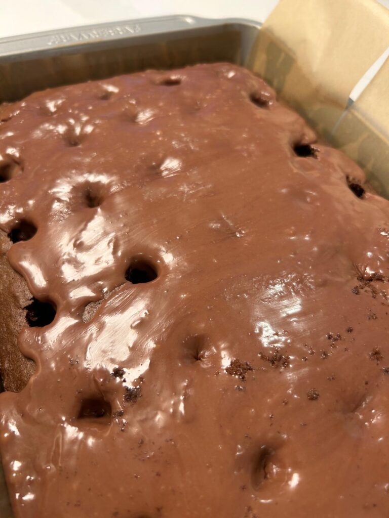 The secret in this recipe is that once the cake has baked and cooled, you take the end of a wooden spoon and poke holes all over. Into those holes goes a heavenly mixture of melted chocolate and sweetened condensed milk, which seeps down into every bite. The result is a cake that feels almost like a cross between a brownie and a classic chocolate sponge – dense, moist, and packed with flavor.
