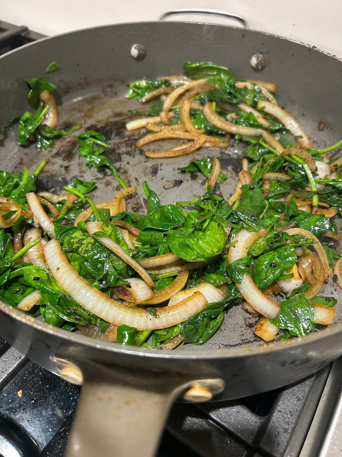 • Add the remaining oil to the skillet. Add the onion and cook until softened. Stir in the spinach and cook until wilted.