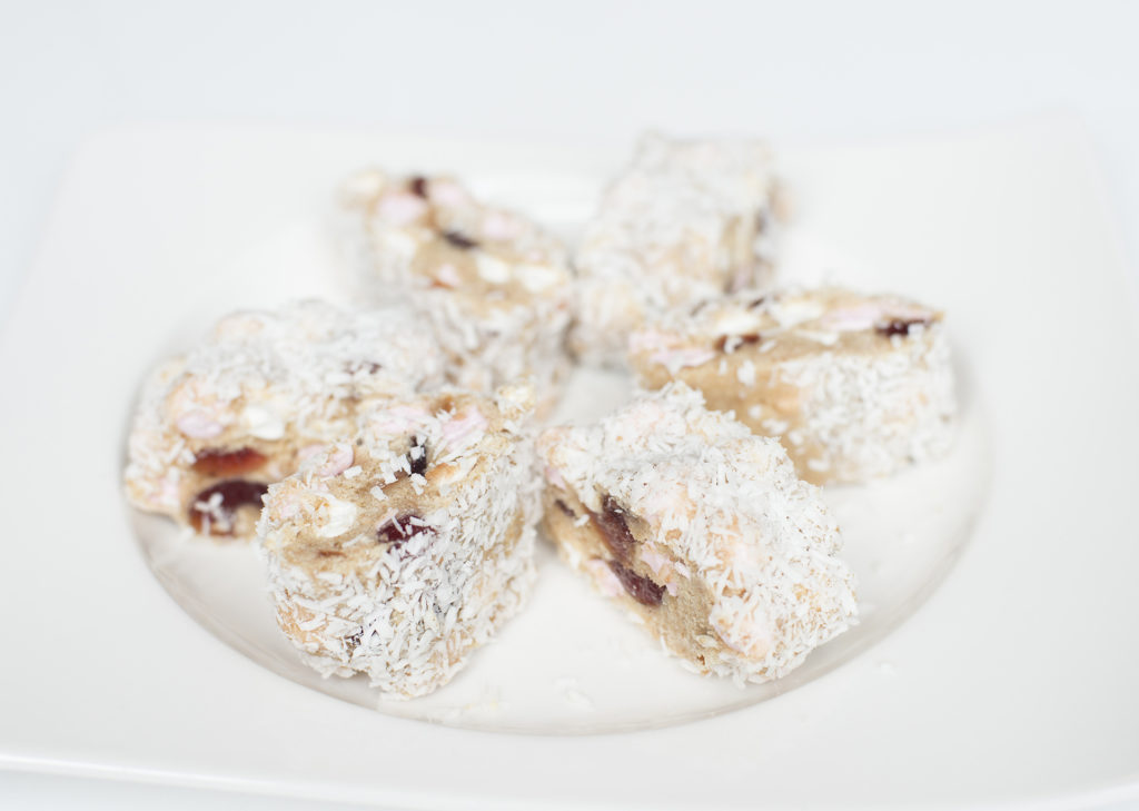 - Place large piece of cling film over a baking tray and cover with the coconut.