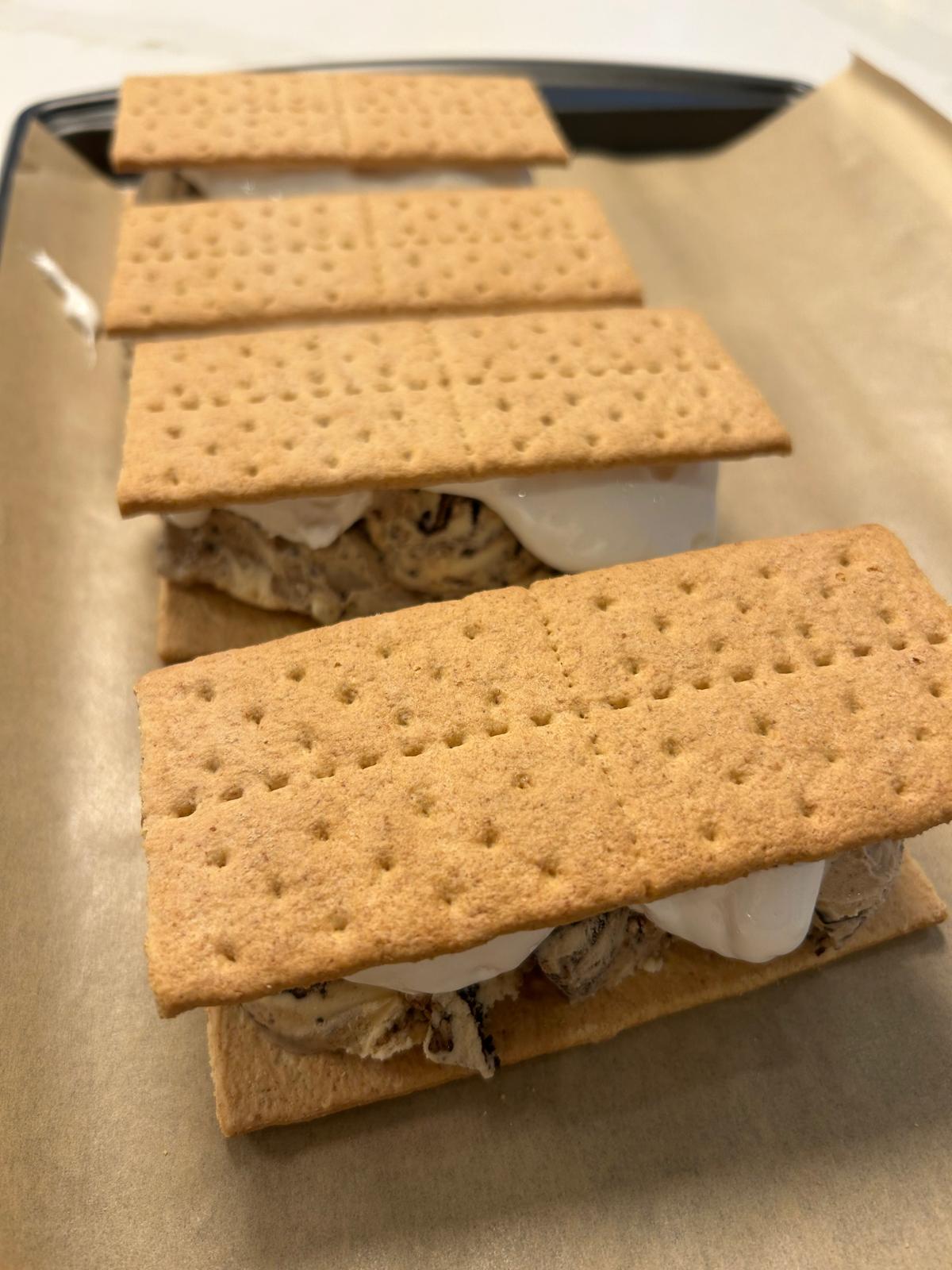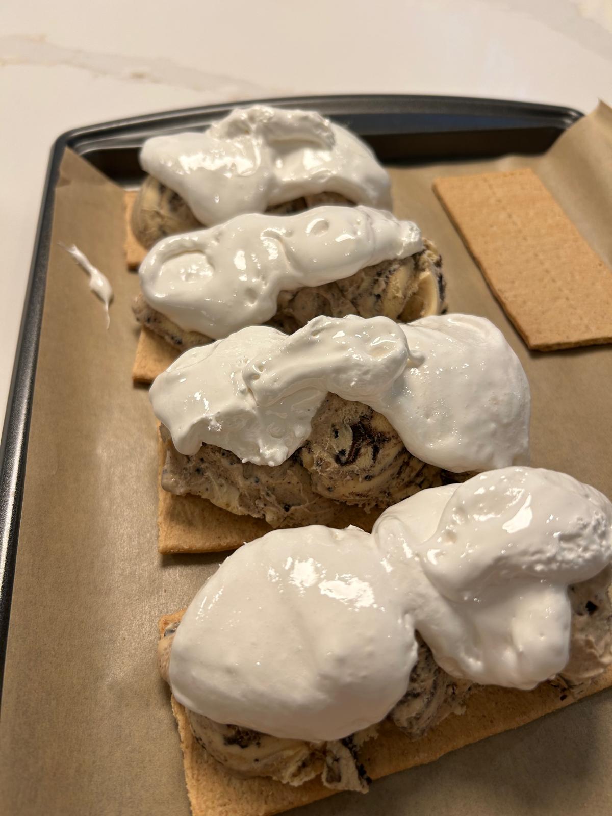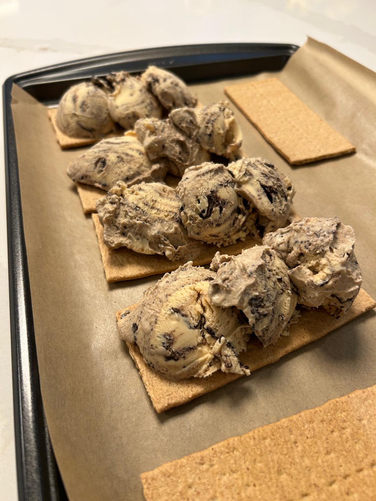 - Lay six graham crackers onto a lined baking sheet and scoop Smores ice cream onto the top of each one.