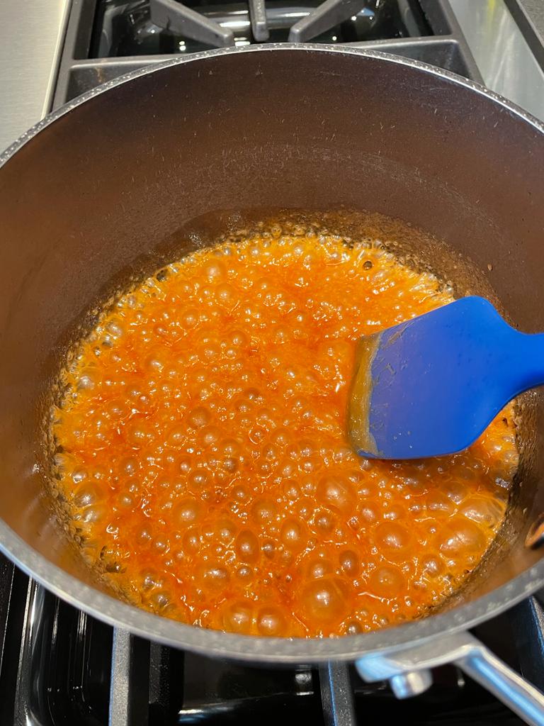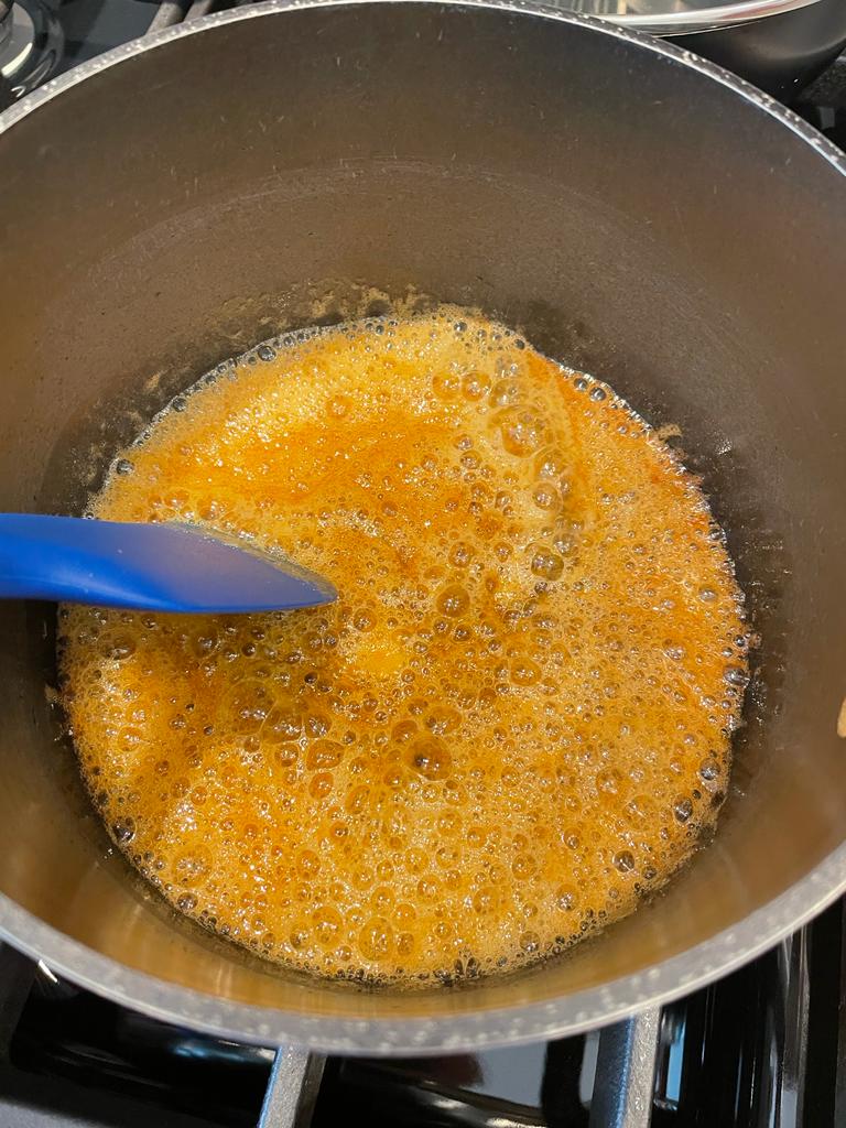 - At this stage add in the butter carefully (it will bubble vigorously) and stir until it has melted and is fully mixed into the caramel.