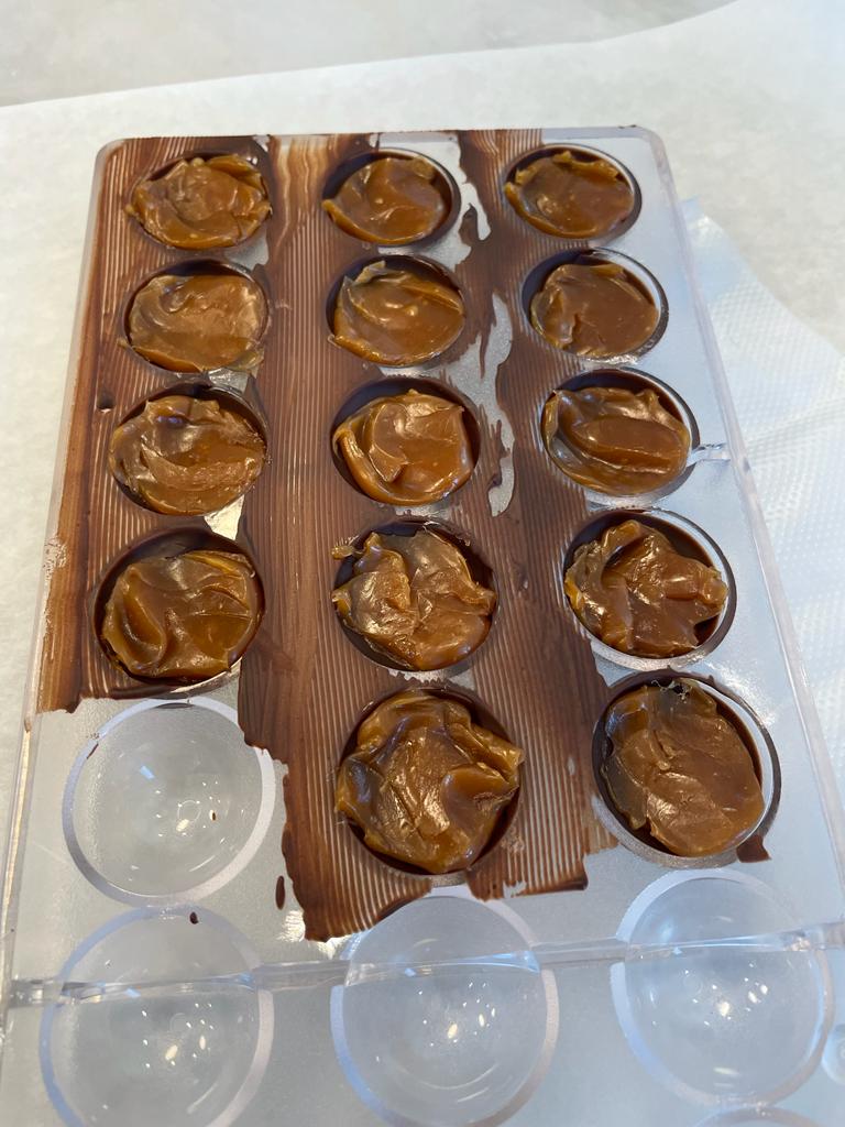 - Once set and the caramel cooled, place the caramel into a small piping bag and pipe around half a teaspoon of caramel into each chocolate shell.