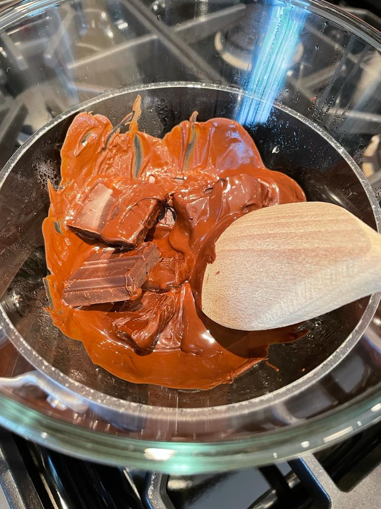 - Place two thirds of the chocolate into a bowl set over a pan of simmering water and melt. Once it reaches 45c remove from the heat even if you still have some unmelted chocolate as it will continue to melt once off the heat.