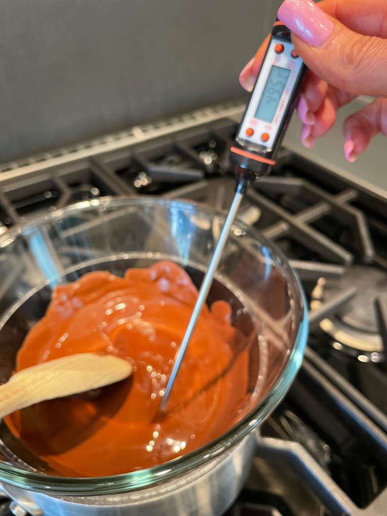 - Place into a bowl and add small pieces of unmelted chocolate stirring until your chocolate reaches 32c. At this point it is tempered and ready to use.