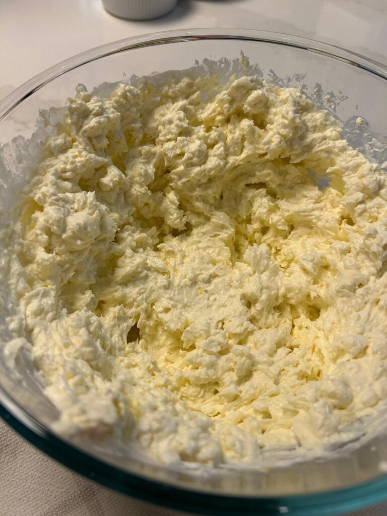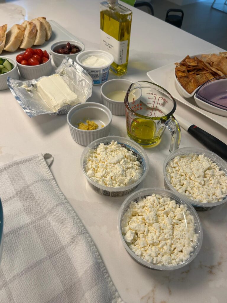 - Place the feta cheese, cream cheese, lemon zest and lemon juice, Greek yoghurt, and olive oil into a large bowl and using an electric whisk, mix until fluffy and fully combined.